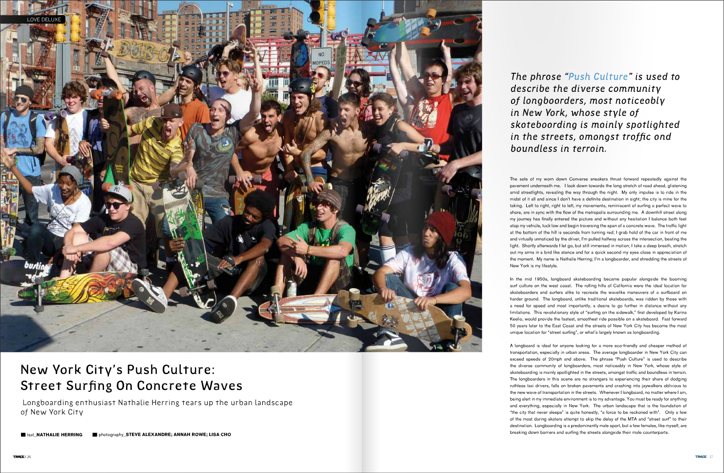 NAT2LEGIT, fulfills the duty as honorary contributing editor with an article that profiles her experience of being a female longboarder in her hometown of New York City. Claude Grunitzy, former Editor-In-Chief of TRACE Magazine, captures her story beautifully in the Spring 2009 issue featuring singer/songwriter Kelis on the cover ...
